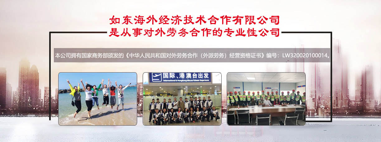 是從事對外勞務合作的專業性公司,本公司擁有國家商務部頒發的《中華人民共和國對外勞務合作(外派勞務)經營資格證書》編號:LW320020100014。從一九九五年開展勞務合作以來,積極開拓進取,先后向日本、加拿大、新加坡、韓國等國家派遣勞務人員近1萬5千余人。勞務合作行業主要有服裝(車工、裁剪、整燙、制板、維修、車間管理)、針織業(織布、漂染、針織、橫機、套口羊毛衫工)、建筑工程(技術人員、瓦工、鋼筋工、拌灰工、木工、油漆工、電工、鋁合金工、水暖工等)、機械工(銑床、車床、沖床、鉆床、鑄造等)電焊工(壓力容器、亞弧焊、建筑設備安裝、船舶、管道工)、遠洋捕撈(職務船員、普通漁工、水手),高級廚師(川菜、粵菜、京菜、淮揚菜)、電子裝配、園藝、蔬菜種植、桑蠶飼養、海、淡水養殖、護士、翻譯(英語、日語、韓國)等,日本辦事處設在日本東京、廣島主要負責管理和服務日本研修生及貿易方面的聯絡工作,國外辦事處和中國公司現有工作人員25人,專職勞務工作人員10人,從事勞務行業均10年以上,翻譯、培訓教師5人,外教2人,會計3人,業務人員5人。